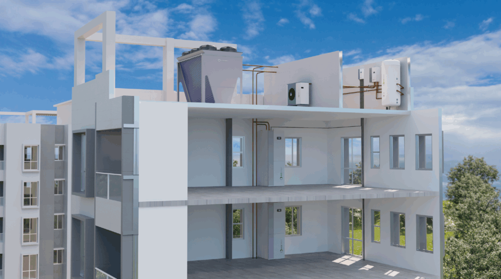 Empezaremos la casa por el tejado. Las bombas de calor para aerotermia son unos sistemas capaces de acumular el agua para producir agua caliente sanitaria (ACS), calor y frío eficientemente.